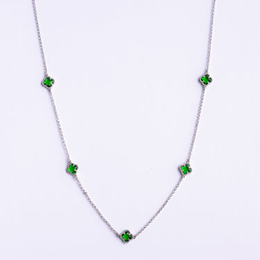This elegant necklace is crafted from high-quality 925 sterling silver, enhanced with a yellow gold plating that adds a touch of sophistication and radiance. The design features distinctive four-leaf clover details adorned with emerald-coloured quartz gemstones, bringing a vibrant and refined charm to the piece.