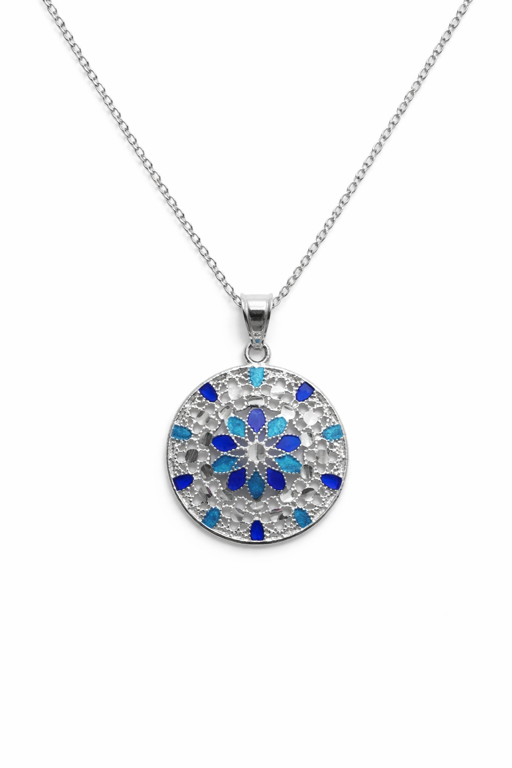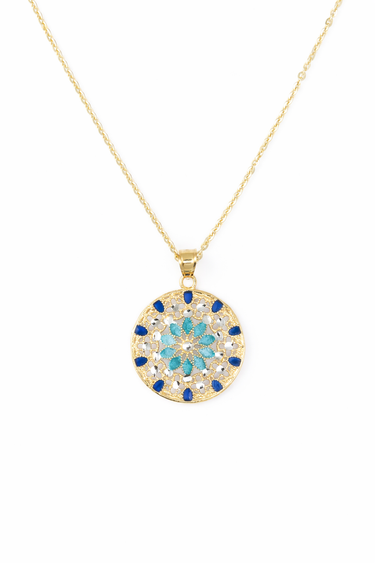 Handcrafted in our Tuscan workshops, this gold-plated pendant features intricate filigree and blue–turquoise enamel details, echoing the light and geometry of Tuscany’s timeless architecture.